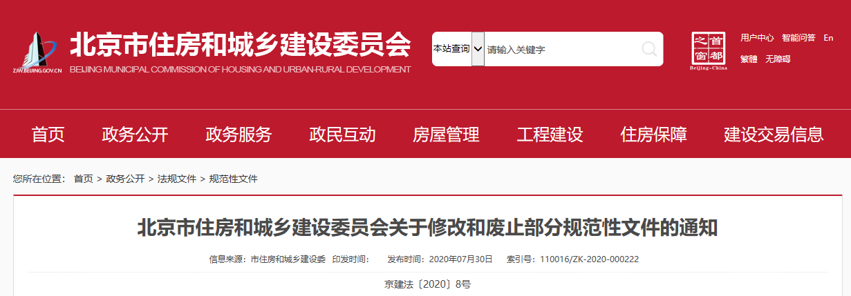 近日北京市住建委发布《关于修改和废止部分规范性文件的通知》,决定修订规范性文件4件,废止规范性文件8件,其中决定修订的文件:
