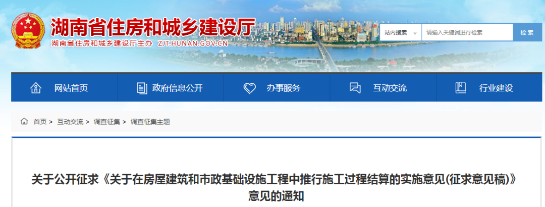 湖南省2020年5月28日,湖南省住建厅发布《关于在房屋建筑和市政基础设施工程中推行施工过程结算的实施意见(征求意见稿)》,在省内房建、市政项目中全面推行施工过程结算。