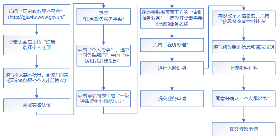 自2020年9月1日起,申请人将统一通过“国家政务服务平台”申报一级建造师初始、增项、重新注册等业务。申请人在国家政务服务平台注册账号并完成实名认证后,通过人脸识别进入所选事项办理页面。若需修改个人信息的,通过“个人信息修改或补充材料”页面,提出申请。(具体申报流程见下图)