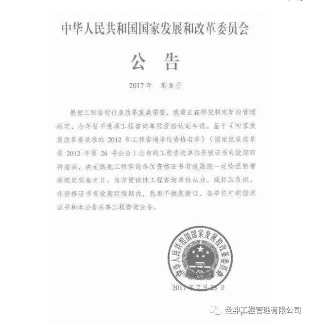 国家发展与改革委发布公告,称:“我委正在研究制定新的管理规定,今年暂不受理工程咨询单位资格认定申请。……在资格证书有效期延续期内,我委不换发新证”。
