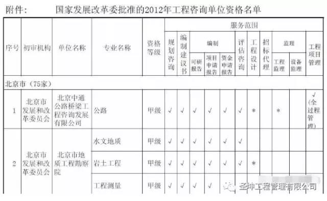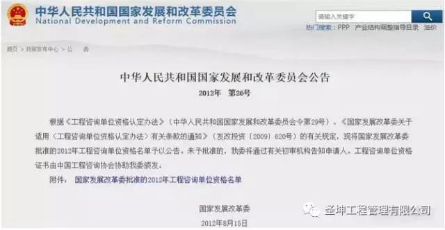 根据《工程咨询单位资格认定办法》(中华人民共和国国家发展和改革委员会令第29号)、《国家发展改革委关于适用〈工程咨询单位资格认定办法〉有关条款的通知》(发改投资〔2009〕620号)的有关规定,现将国家发展改革委批准的2012年工程咨询单位资格名单予以公告。未予批准的,我委将通过有关初审机构告知申请人。工程咨询单位资格证书由中国工程咨询协会协助我委颁发。