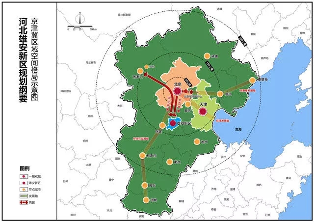 “一主”即起步区,选择容城、安新两县交界区域作为起步区,是新区的主城区,按组团式布局,先行启动建设。“五辅”即雄县、容城、安新县城及寨里、昝岗五个外围组团,全面提质扩容雄县、容城两个县城,优化调整安新县城,建设寨里、昝岗两个组团,与起步区之间建设生态隔离带。“多节点”即若干特色小城镇和美丽乡村,实行分类特色发展,划定特色小城镇开发边界,严禁大规模开发房地产。