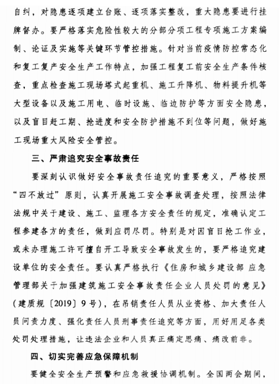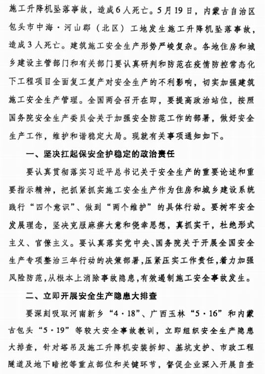 日前,住建部办公厅下发《关于加强疫情防控常态化建筑施工安全生产工作的紧急通知》。通知指出,为深刻吸取河南新乡“4·18”四死事故、广西玉林“5·16”六死事故和内蒙古包头“5·19”三死事故等教训,决定立即组织安全生产隐患大排查。1、重点检查施工现场塔式起重机、施工升降机、物料提升机等大型设备;