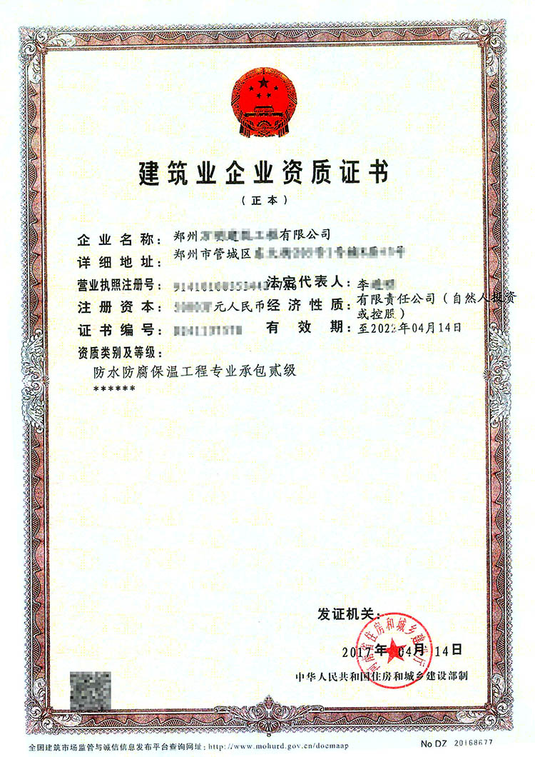 防水防腐保温工程专业承包二级资质证书
