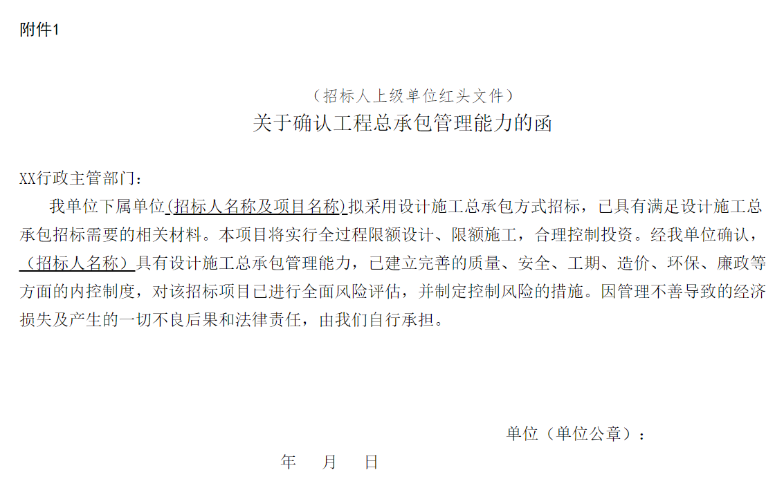 经招标人承诺或其上级主管单位确认,可以开展招标工作(附件1或附件2)。采用代建制的,由建设单位参照附件1出具相关函件,同意招标项目采用工程总承包模式招标,并对代建单位的工程总承包管理能力进行确认。