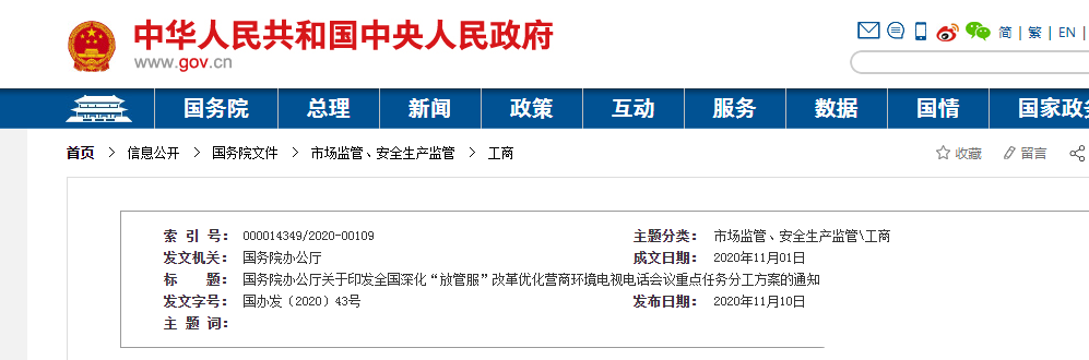 党中央、国务院高度重视深化“放管服”改革优化营商环境工作。2020年9月11日,李克强总理在全国深化“放管服”改革优化营商环境电视电话会议上发表重要讲话,部署进一步深化“放管服”改革,加快打造市场化法治化国际化营商环境,不断激发市场主体活力和发展内生动力。为确保会议确定的重点任务落到实处,现制定如下分工方案。