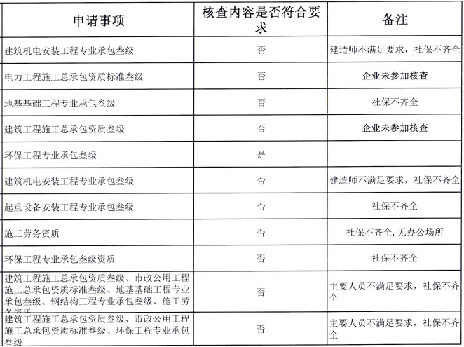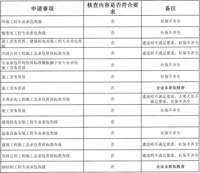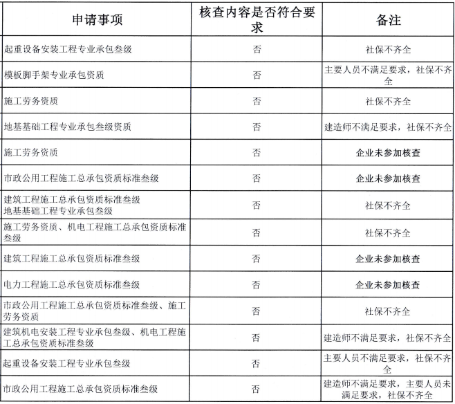 原因主要为:社保不齐全、建造师不满足要求、主要人员不满足要求。
