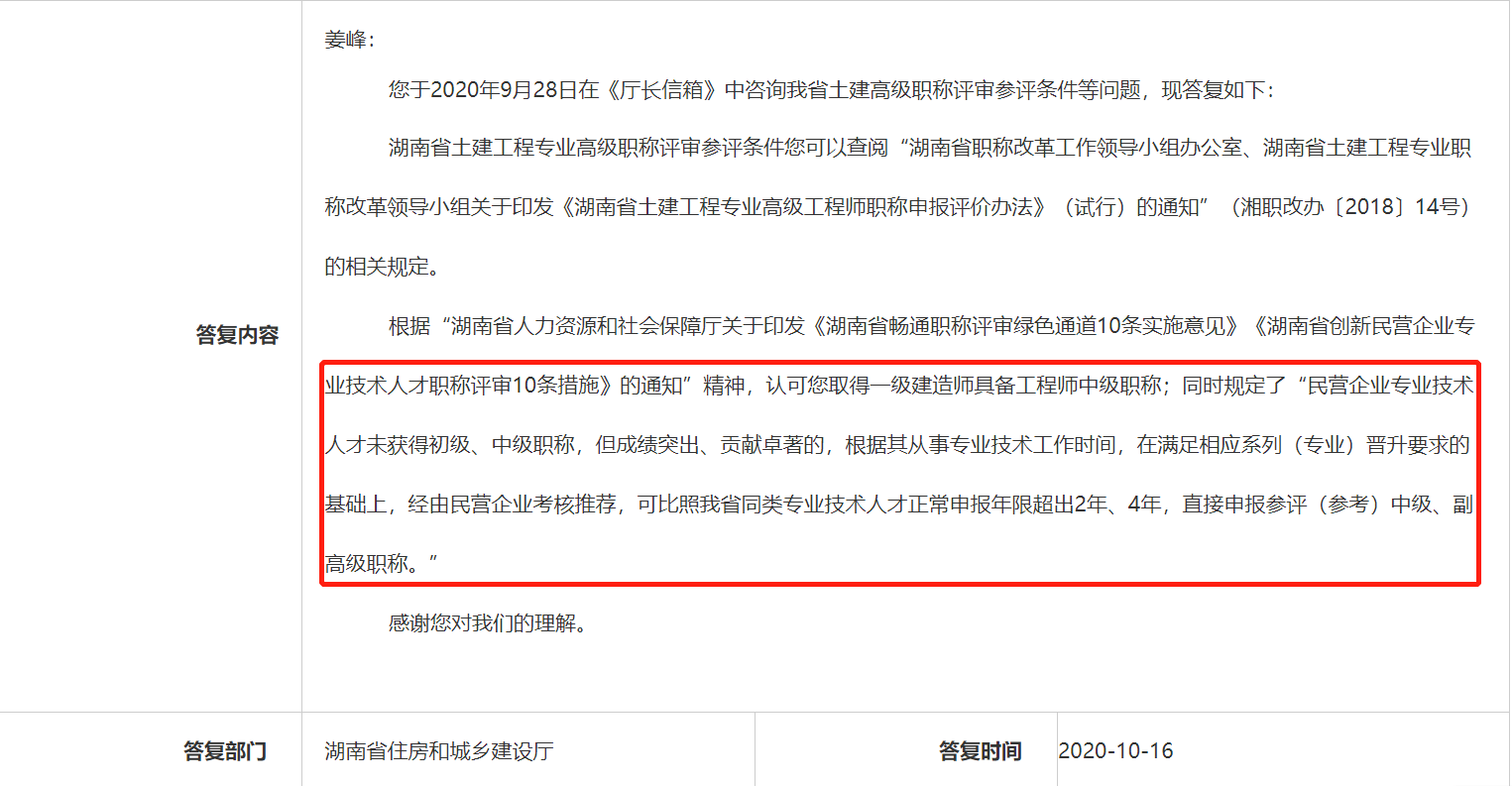 您于2020年9月28日在《厅长信箱》中咨询我省土建高级职称评审参评条件等问题,现答复如下:
