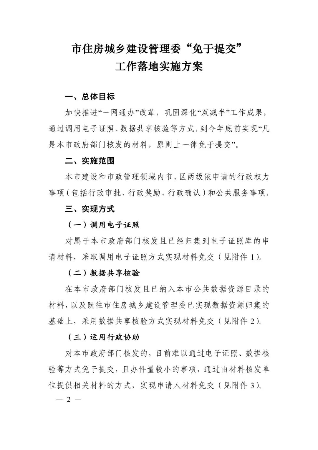 关于印发《市住房城乡建设管理委“免于提交”工作落地实施方案》的通知