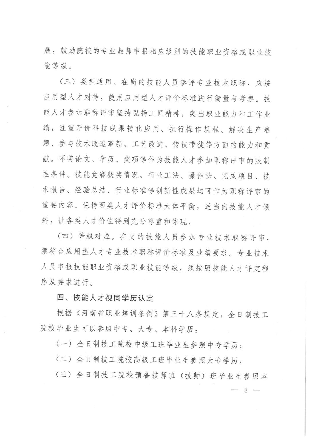 三是类型适用。主要是针对技能人才申报专业技术职称,要按照应用型人才评价方式和标准,主要考察技能人才的职业能力和工作业绩,弘扬工匠精神,不将论文、学历、奖项等作为评价技能人才的限制性条件;
