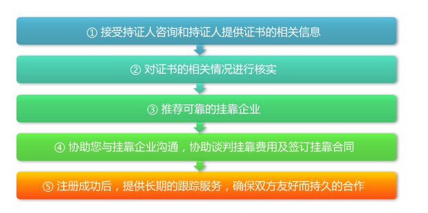公司是国内较早开展执业资格证书挂靠业务的网站,常年为全国的建筑设计、建筑施工、工程监理、造价咨询服务,帮助企业实现申办、维护、升级资质的目标,具体服务流程如下: