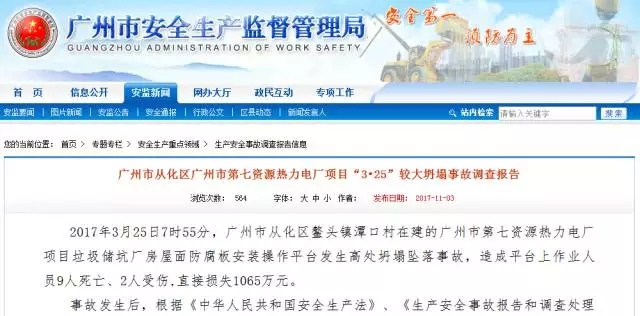 2017年3月25日7时55分,广州市从化区鳌头镇潭口村在建的广州市第七资源热力电厂项目垃圾储坑厂房屋面防腐板安装操作平台发生高处坍塌坠落事故,造成平台上作业人员9人死亡、2人受伤,直接损失1065万元。