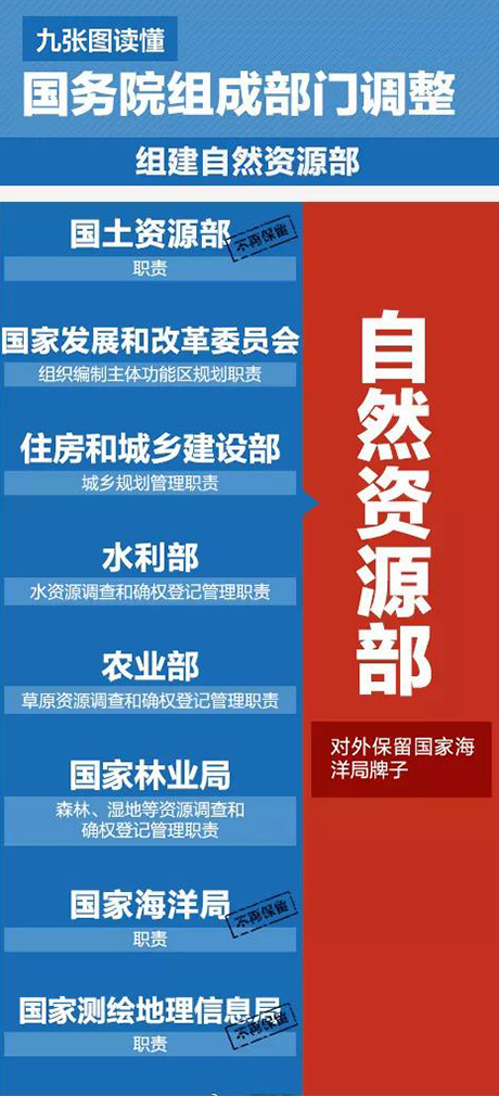(一)组建自然资源部。将国土资源部的职责,国家发展和改革委员会的组织编制主体功能区规划职责,住房和城乡建设部的城乡规划管理职责,水利部的水资源调查和确权登记管理职责,农业部的草原资源调查和确权登记管理职责,国家林业局的森林、湿地等资源调查和确权登记管理职责,国家海洋局的职责,国家测绘地理信息局的职责整合,组建自然资源部,作为国务院组成部门。自然资源部对外保留国家海洋局牌子。