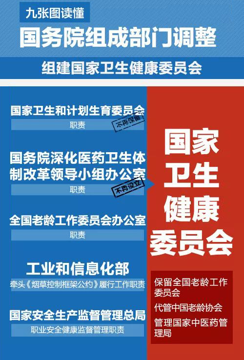 (五)组建国家卫生健康委员会。将国家卫生和计划生育委员会、国务院深化医疗卫生体制改革领导小组办公室、全国老龄工作委员会办公室的职责,工业和信息化部的牵头《烟草控制框架公约》履约工作职责,国家安全生产监督管理总局的职业安全健康监督管理职责整合,组建国家卫生健康委员会,作为国务院组成部门。