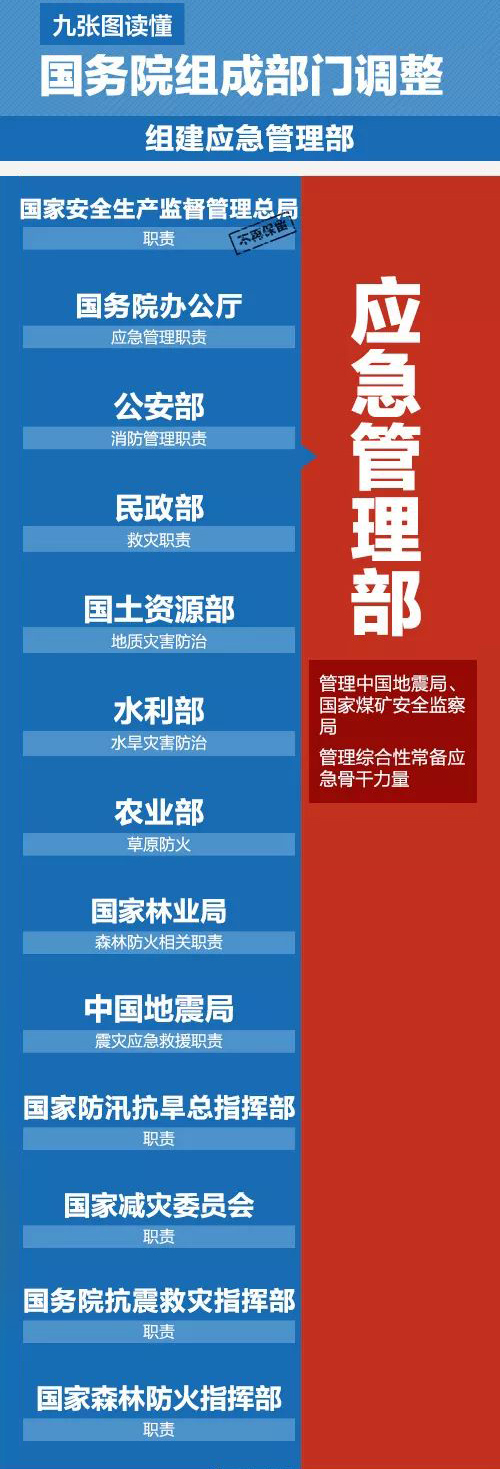 (七)组建应急管理部。将国家安全生产监督管理总局的职责,国务院办公厅的应急管理职责,公安部的消防管理职责,民政部的救灾职责,国土资源部的地质灾害防治、水利部的水旱灾害防治、农业部的草原防火、国家林业局的森林防火相关职责,中国地震局的震灾应急救援职责以及国家防汛抗旱总指挥部、国家减灾委员会、国务院抗震救灾指挥部、国家森林防火指挥部的职责整合,组建应急管理部,作为国务院组成部门。