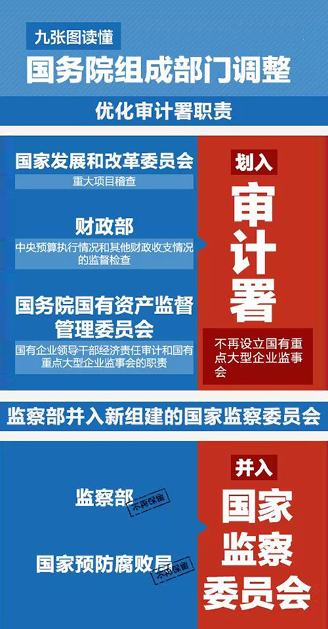 (十一)优化审计署职责。将国家发展和改革委员会的重大项目稽查、财政部的中央预算执行情况和其他财政收支情况的监督检查、国务院国有资产监督管理委员会的国有企业领导干部经济责任审计和国有重点大型企业监事会的职责划入审计署,构建统一高效审计监督体系。