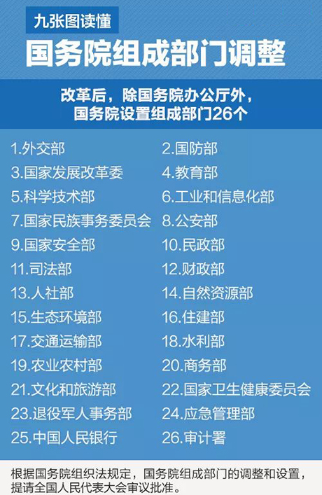 今天,国务院机构改革方案提请十三届全国人大一次会议审议。根据该方案,国务院正部级机构减少8个,副部级机构减少7个,除国务院办公厅外,国务院设置组成部门26个。调整涉及哪些部门?新部门、新机构有何职责?一起来看。