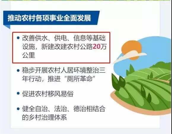2018年还将推动农村各项事业全面发展。改善供水、供电、信息等基础设施,新建改建农村公路20万公里。稳步开展农村人居环境整治三年行动,推进“厕所革命”。