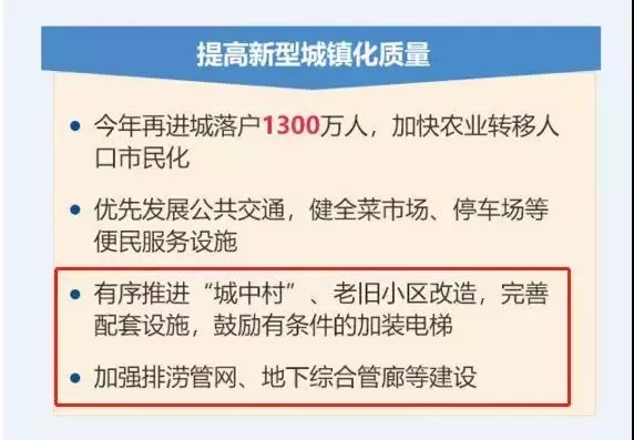 提高新型城镇化质量。有序推进“城中村”、老旧小区改造,完善配套设施,鼓励有条件的加装电梯。加强排涝管网、地下综合管廊等建设。