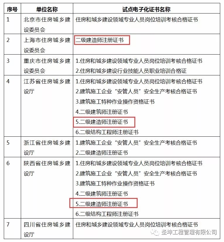 住建部下发《关于同意在部分地区开展住房和城乡建设领域从业人员有关证书电子化试点的复函》,将全面开展二级建造师证书、“三类人员”证书(A/B/C证)、住房和城乡建设领域专业人员岗位培训考核合格证书等电子化试点工作,将在7省市(北京市、上海市、重庆市、江苏省、浙江省、陕西省、四川省)开启。