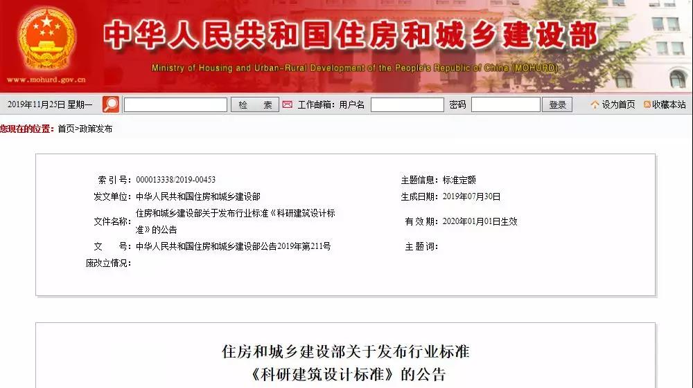 《科研建筑设计标准》为行业标准,编号为JGJ91-2019,自2020年1月1日起实施。