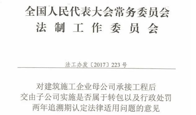 2017年,住建部曾向全国人大法工委发出请示函,全国人大法工委作出《对建筑施工企业母公司承接工程后交由子公司实施是否属于转包以及行政处罚两年追溯期认定法律适用问题的意见》(法工办发[2017]223号,以下简称《意见》)认为: