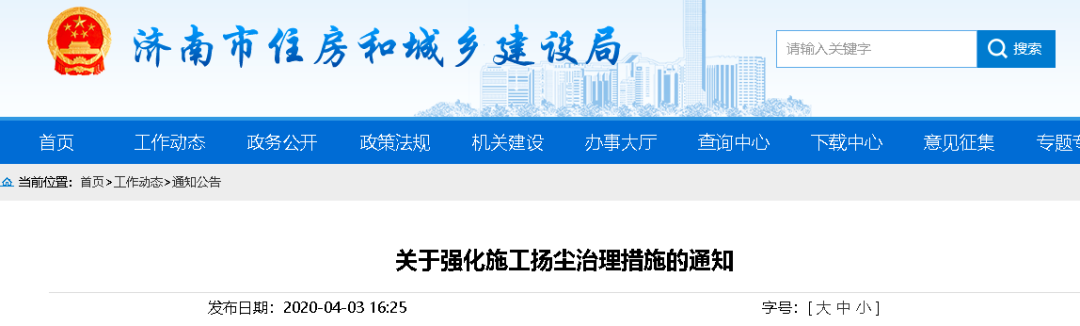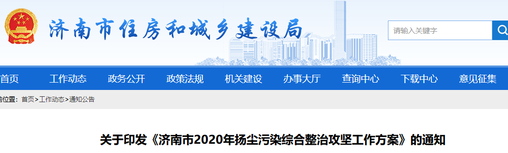 同日,山东省济南市大气防治指挥部、扬尘办联合下发《2020年扬尘污染综合整治攻坚工作方案》,住建等八部门综合运用行政、经济和技术等手段,以最严格的措施实施扬尘污染综合整治。