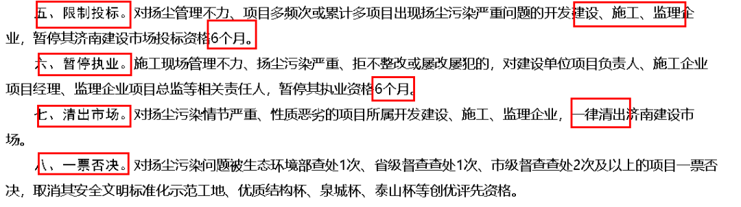 4月3日,济南市住建局发布《关于强化施工扬尘治理措施的通知》(以下简称《通知》),明确将通过源头把关、信用惩戒、问题曝光、约谈法人、限制投标、暂停执业、清出市场、一票否决等八项措施,强化建筑工地扬尘治理,污染严重的项目参建各方将被实施信用惩戒,相关单位及个人也将被暂停投标及执业资格6个月。