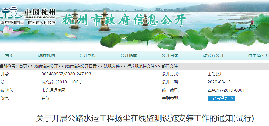 日前,浙江省杭州市《关于开展公路水运工程扬尘在线监测设施安装工作的通知(试行)》(以下简称《通知》)实行,旨在进一步提升施工现场扬尘管控科技水平,找准污染源头,形成“源头严防、过程严管”的污染防治体系。