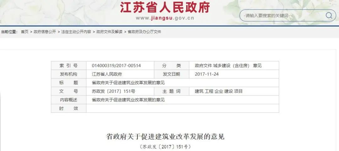 江苏省人民政府在《江苏省关于促进建筑业改革发展的意见》中明确: