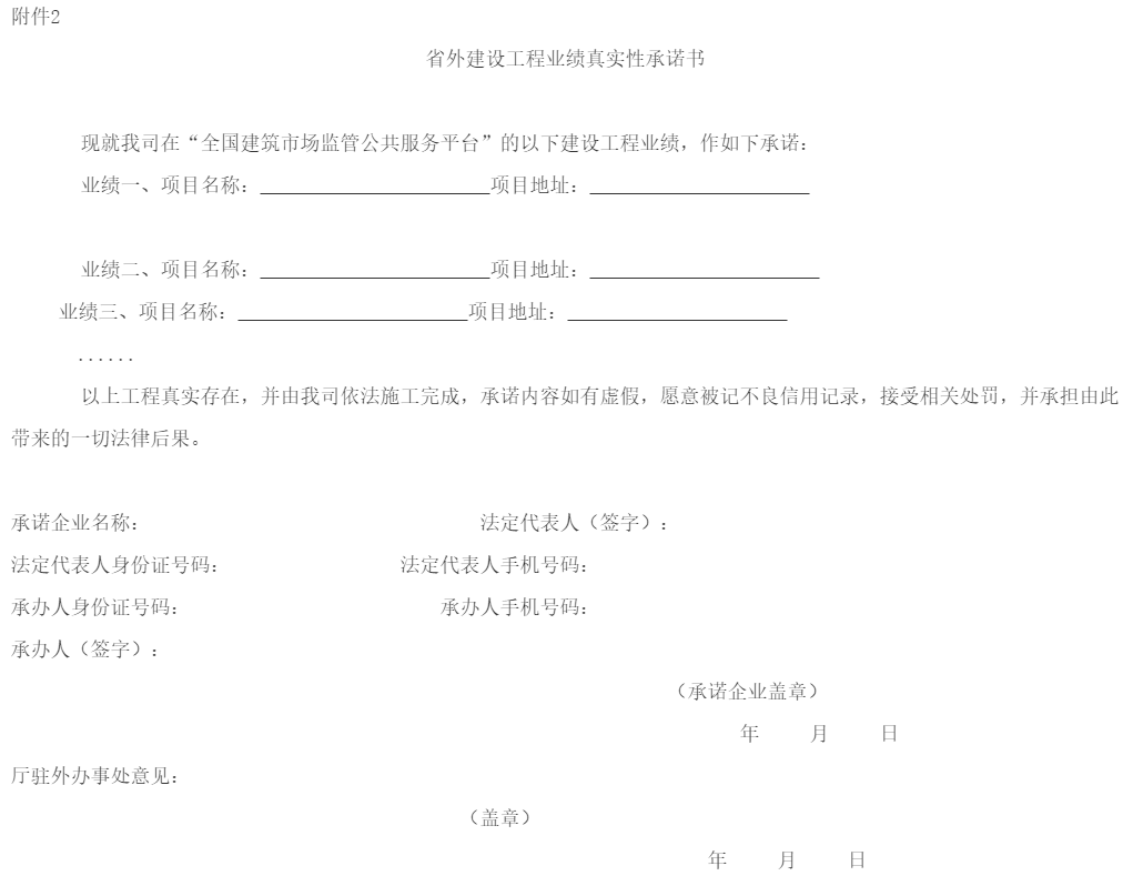 省外完成的工程业绩。本省建筑业企业申请省级许可资质,使用省外完成的企业业绩和个人业绩,该业绩必须进入全国建筑市场监管公共服务平台。企业填写“省外建设工程业绩真实性承诺书”(附件2),由工程项目所在区域的我厅驻外办事处(附件3)负责将承诺书及工程业绩材料一并报省住房城乡建设厅,导入江苏省建筑业监管信息平台2.0。